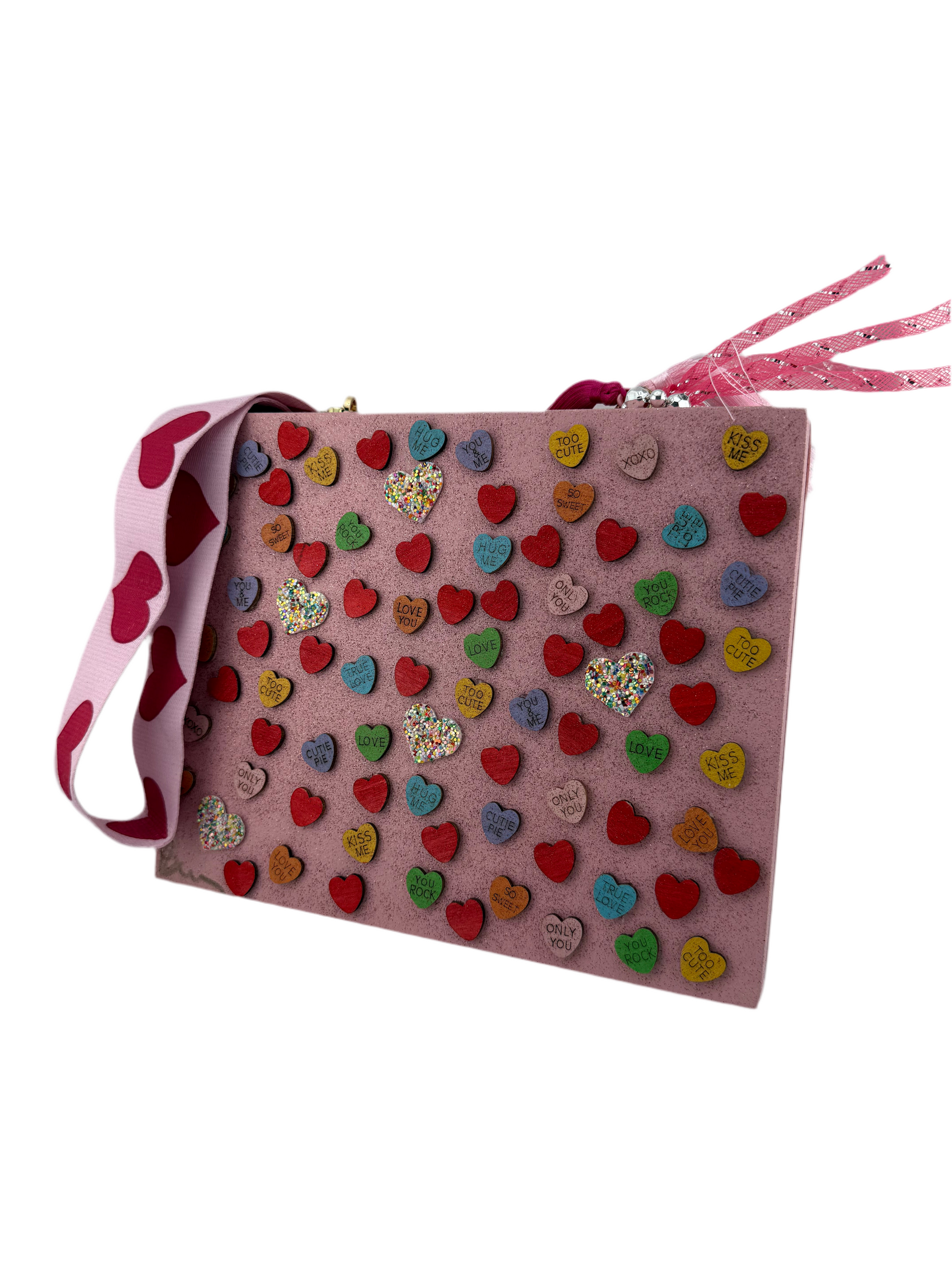 Front: Covered in colorful candy hearts + sparkling accents 💜💛💚