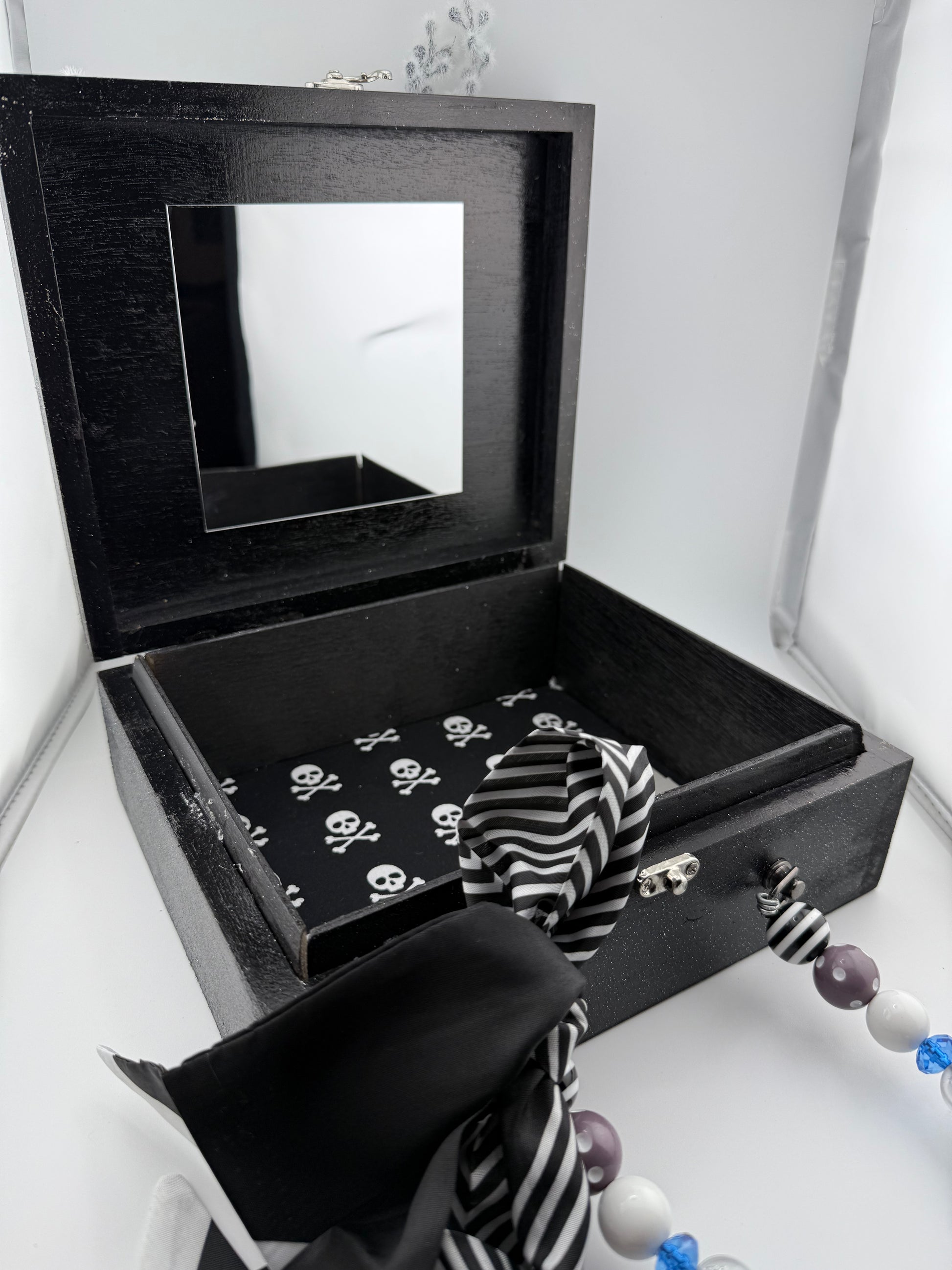 Make a bold statement this spooky season with this one-of-a-kind Stay Spooky cigar box purse, handmade by designer Sarah Schafer.